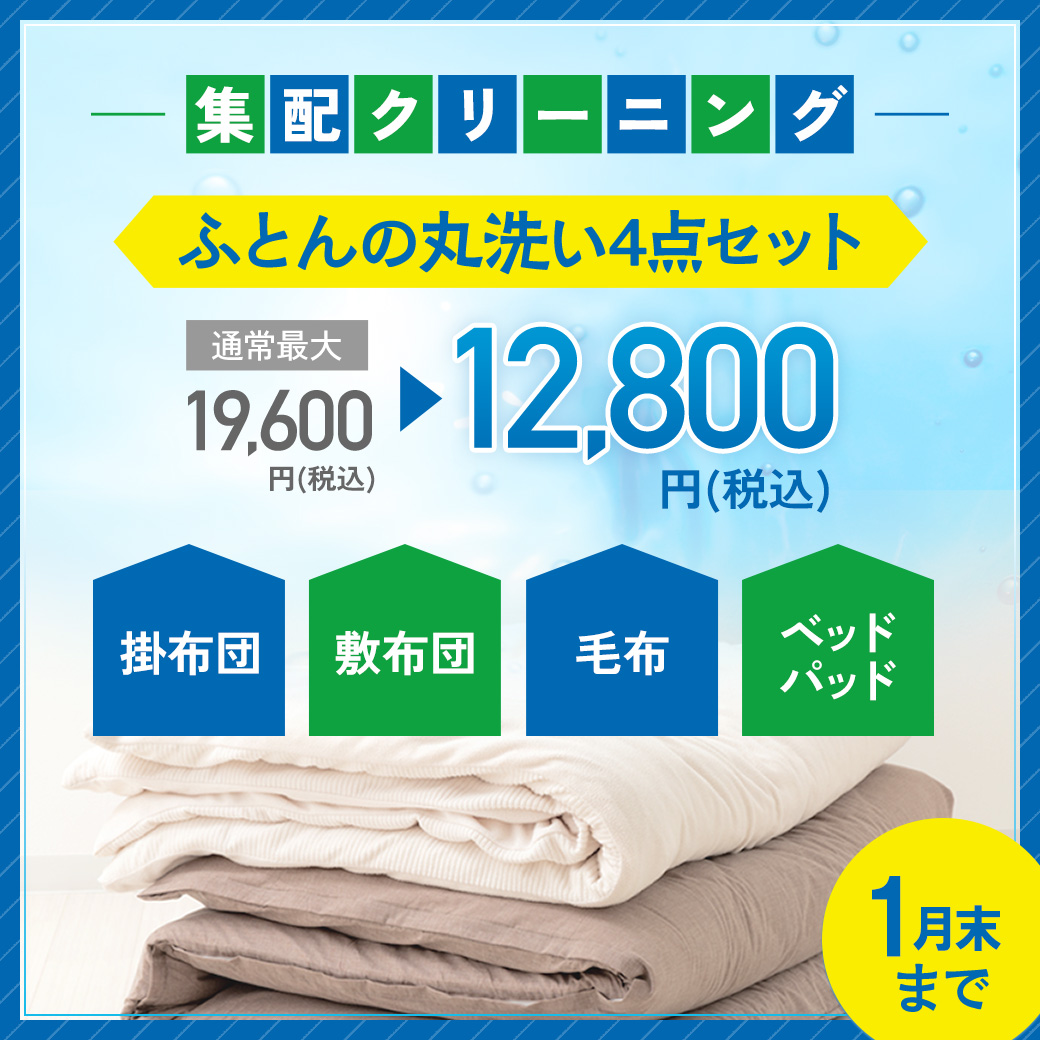 まとめてお得!ふとんの丸洗い4点セットしまい洗い、引っ越し準備におすすめ★お店まで運ぶのが大変な大きな布団はタカノにお任せ! 2026年1月31日(土)まで